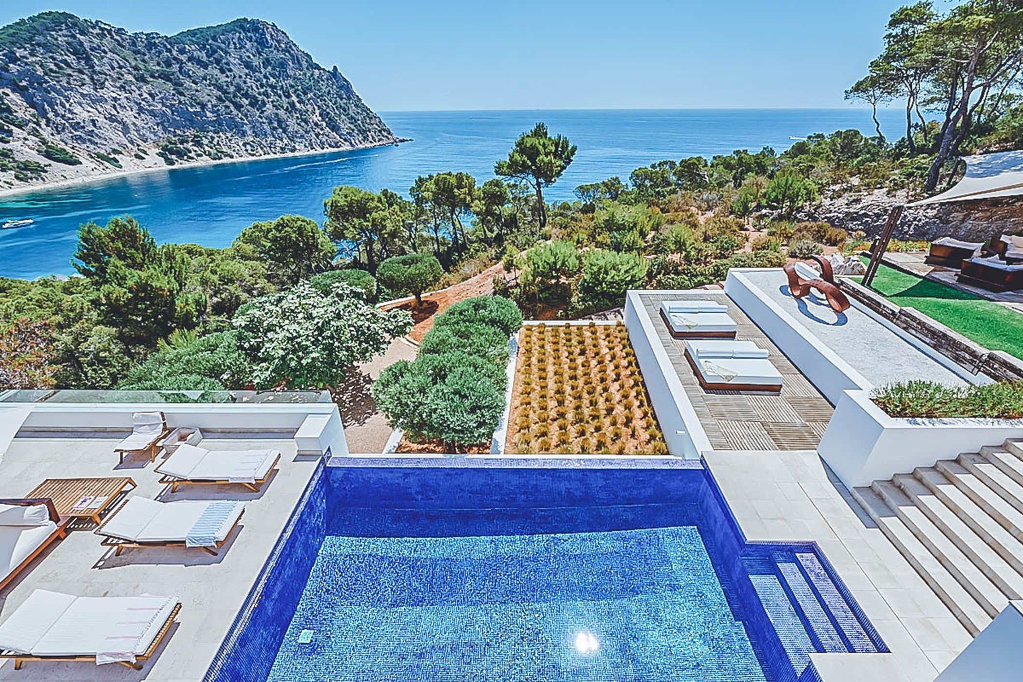 The exterior of Villa Judith has many attractions, including an inviting swimming pool with several sun-decked terraces, a feature bespoke chill-out area with luxurious sun loungers, a shaded dining area and beautifully maintained luscious lawns, all of which provide the ideal setting to truly appreciate the stunning seaviews.